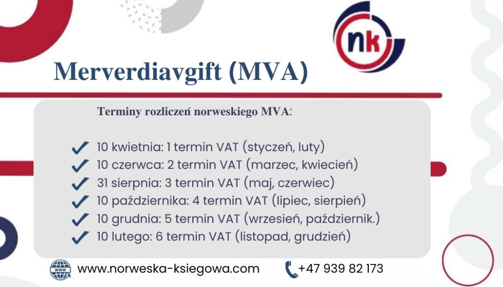 𝐌𝐞𝐫𝐯𝐞𝐫𝐝𝐢𝐚𝐯𝐠𝐢𝐟𝐭 (𝐌𝐕𝐀), norweski podatek od towarów i usług (Merverdiavgift), to system opodatkowania stosowany w Norwegii.  Firmy zobowiązane są do składania deklaracji podatkowych dotyczących MVA co 2 miesiące.