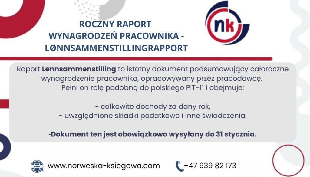 Raport Lønnsammenstilling to istotny dokument podsumowujący całoroczne wynagrodzenie pracownika, opracowywany przez pracodawcę. Pełni on rolę podobną do polskiego PIT-11. Poniżej przedstawiamy najważniejsze informacje w bardziej uporządkowany sposób: