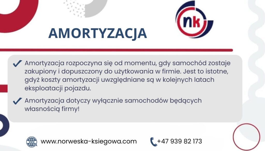 Koszty w punkcie drugim i trzecim nazywamy właśnie amortyzacją. Warto podkreślić, że stawki amortyzacyjne dla samochodów osobowych w Norwegii zazwyczaj wynoszą 20% wartości początkowej pojazdu rocznie.