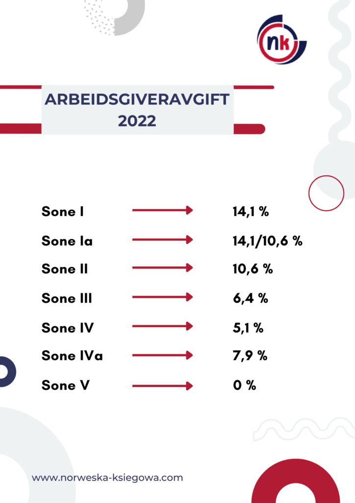 Arbeidsgiveravgift – podatek pracodawcy, płatny w zależności od Sone, w której zarejestrowana jest firma. Podatek płatny co 2 miesiące. Szczególne przypadki rozliczane są gdy firma prowadzi działalnością w branży sektorowej. Bądź posiada oddziały w różnych częściach Norwegii. Znaczenie ma również oddelegowanie pracowników poza oddział firmy i długość tego pobytu w stosunku do reszty czasu pracy. Poniżej stawki %.