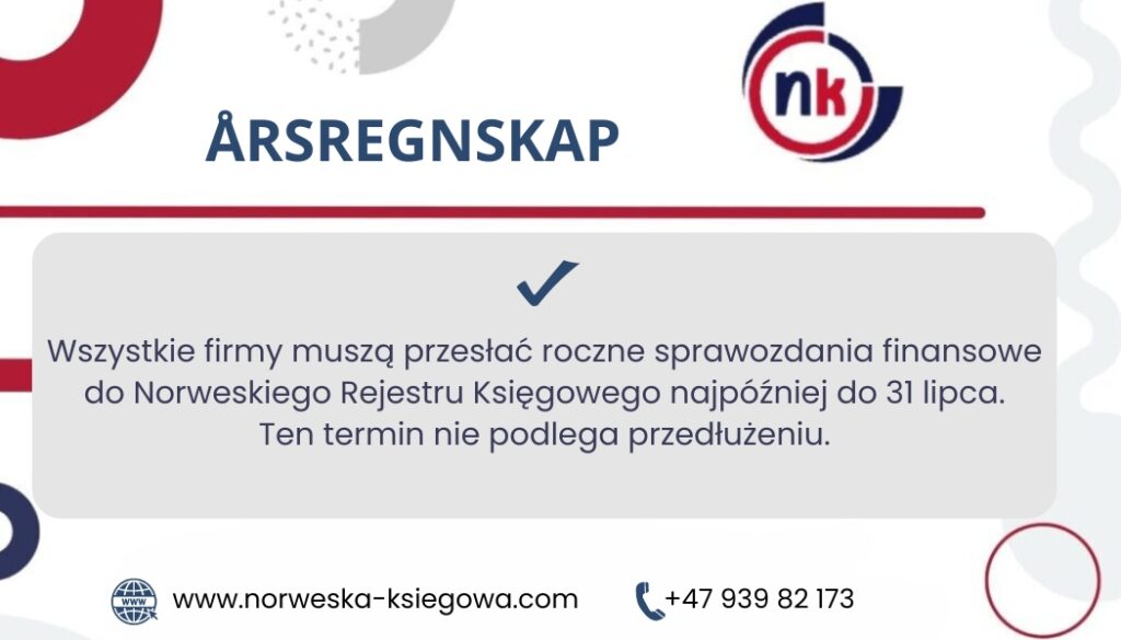 Obowiązek składania sprawozdań: Wszystkie firmy muszą przesłać roczne sprawozdania finansowe do Norweskiego Rejestru Księgowego najpóźniej do 31 lipca. Ten termin nie podlega przedłużeniu.