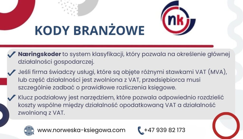 Każda firma zarejestrowana w Norwegii otrzymuje kod branżowy (næringskode), który identyfikuje jej główną działalność. Kod ten jest przypisany do przedsiębiorstwa na etapie zakładania firmy, a jego celem jest głównie zapewnienie dokładnych danych statystycznych dla Norweskiego Urzędu Statystycznego (SSB). Na przykład, firma zajmująca się sprzedażą detaliczną może mieć kod 47.110, a firma budowlana specjalizująca się w remontach domów kod 43.320.