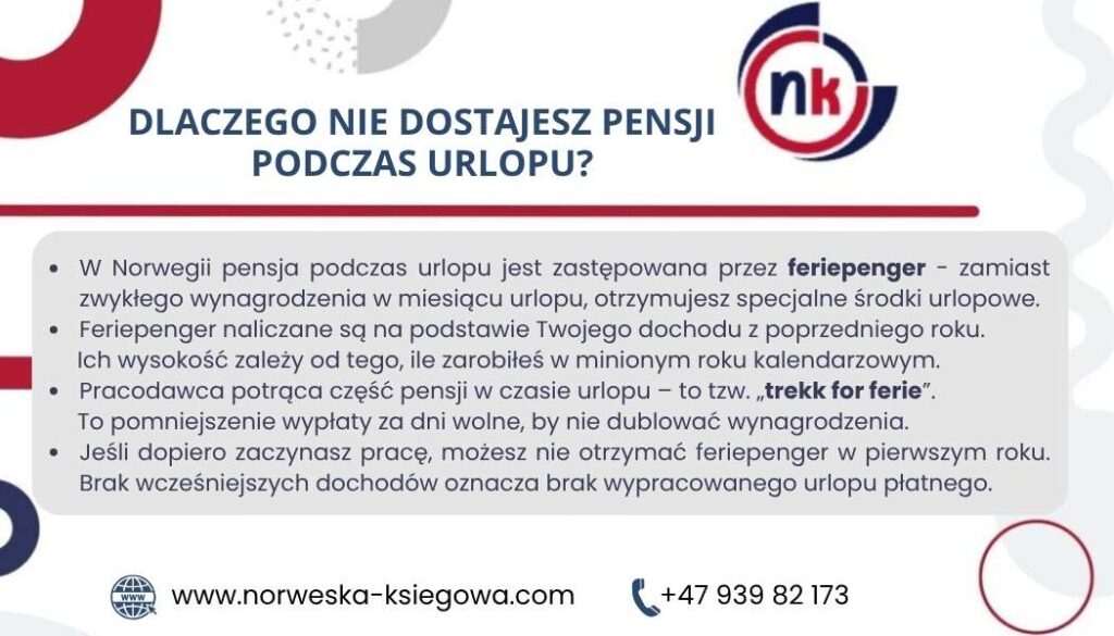 Podsumowując: choć może się wydawać, że w miesiącu urlopu otrzymujesz mniej pieniędzy, w rzeczywistości Twoje wynagrodzenie jest tylko inaczej rozłożone. Feriepenger nie są „dodatkiem”, a formą wynagrodzenia za czas wolny, wypłacaną w inny sposób niż pensja. Norweski model zapewnia przejrzystość i równowagę finansową, choć może wymagać przyzwyczajenia.