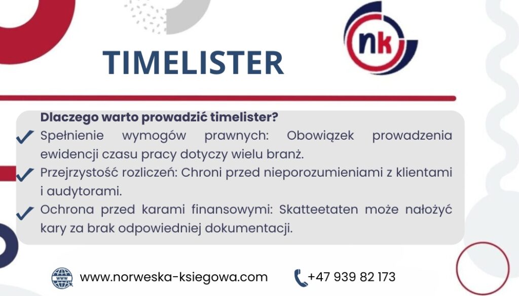 Twoje Autoryzowane Biuro Księgowe przypomina, jak istotne jest prowadzenie timelister zgodnie z norweskimi przepisami prawa pracy i księgowości. Oto kluczowe informacje i zalecenia: