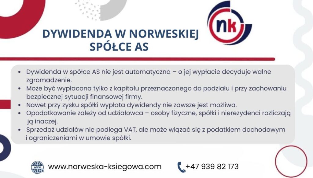 Dywidenda w norweskiej spółce typu AS (Aksjeselskap) nie jest automatycznym prawem udziałowca. O jej wypłacie każdorazowo decyduje walne zgromadzenie (generalforsamling), a cały proces musi być zgodny z przepisami Aksjeloven.