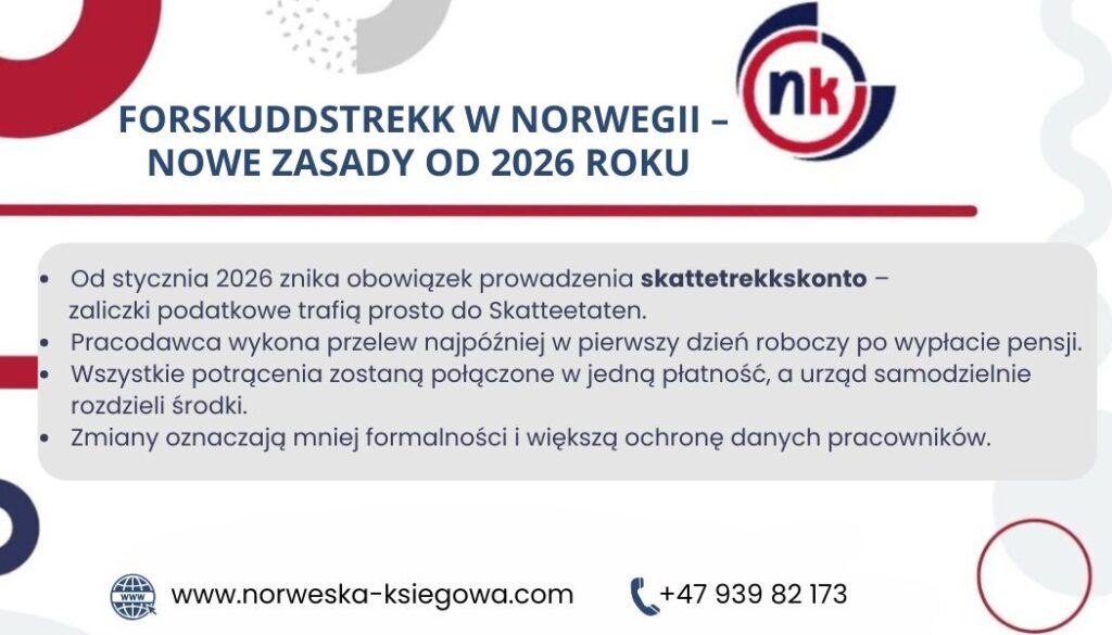 | Konto skattetrekk | Zaliczki trafiają na osobne konto bankowe (skattetrekkskonto). | Skattetrekkskonto zostaje zlikwidowane – pieniądze idą bezpośrednio do Skatteetaten. | Mniej procedur administracyjnych, brak konieczności obsługi specjalnego konta. |