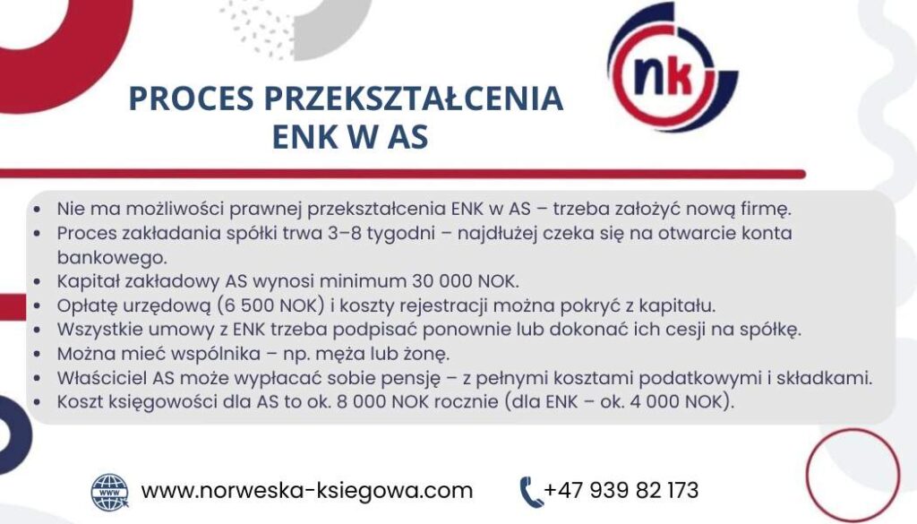 | Obowiązki dodatkowe w AS | • VAT – 25%• Księgowość roczna – ok. 8 000 NOK• Rejestr akcjonariuszy – 1 490 NOK + MVA• Inne formularze, np. beneficjenci rzeczywiści |