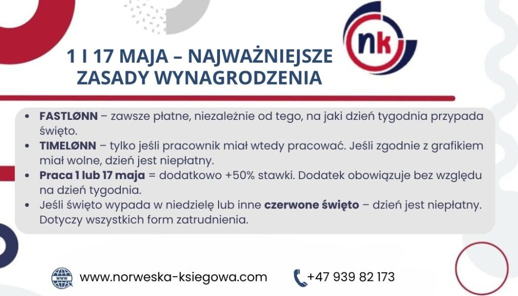 | Pracownik zatrudniony na FASTLØNN (pensja miesięczna) | ✅ TAK | 1 i 17 maja są zawsze płatne – niezależnie od dnia tygodnia |