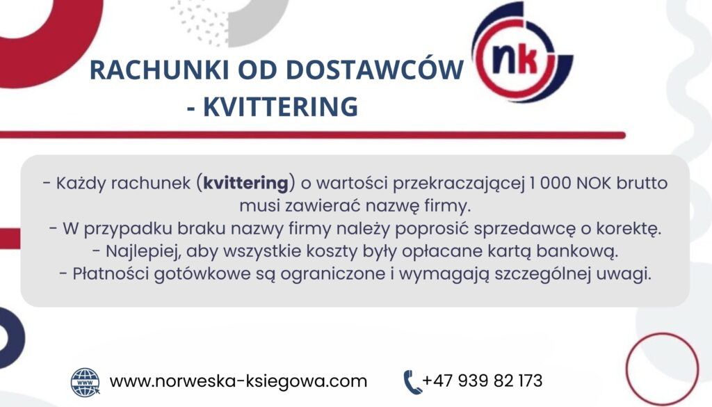 – Każdy rachunek (kvittering) o wartości przekraczającej 1 000 NOK brutto musi zawierać nazwę firmy.