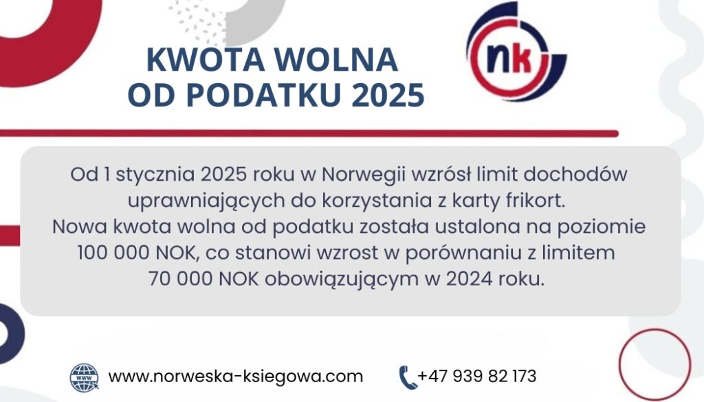 | Podsumowanie | – Kwota wolna i limit frikort od 2025 r.: 100 000 NOK. |