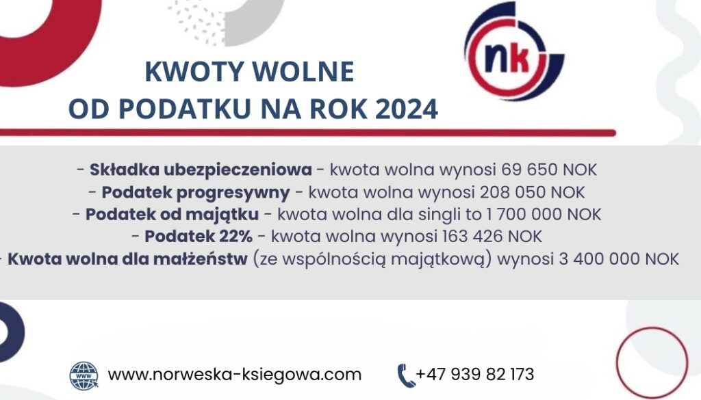 – Podatek 22% –  kwota wolna wynosi 163 426 NOK (Skatt fra Alminnelig Inntekt)