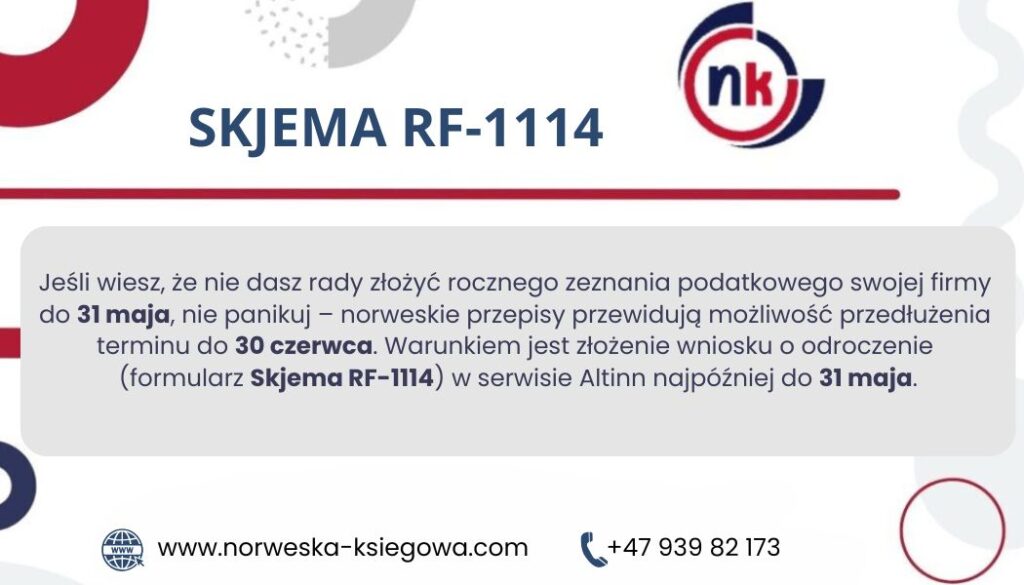 Jeśli wiesz, że nie dasz rady złożyć rocznego zeznania podatkowego swojej firmy do 31 maja, nie panikuj – norweskie przepisy przewidują możliwość przedłużenia terminu do 30 czerwca. Warunkiem jest złożenie wniosku o odroczenie (formularz Skjema RF-1114) w serwisie Altinn najpóźniej do 31 maja.