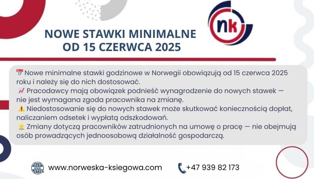Od 15 czerwca 2025 roku w Norwegii obowiązują nowe stawki minimalne w wielu branżach. Pracodawcy mają obowiązek dostosować wynagrodzenie pracowników do zaktualizowanych kwot. Brak podniesienia stawek może skutkować koniecznością dopłat z odsetkami lub odszkodowaniem. Nowe przepisy dotyczą osób zatrudnionych na umowę o pracę (zarówno na godzinę, jak i na kontrakt), nie obejmują natomiast jednoosobowych działalności gospodarczych. Poniżej przedstawiamy aktualne stawki obowiązujące od 15.06.2025 r.: