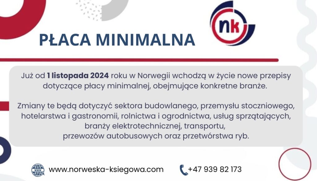 Już od 1 listopada 2024 roku w Norwegii wchodzą w życie nowe przepisy dotyczące płacy minimalnej, obejmujące konkretne branże. Zmiany te będą dotyczyć sektora budowlanego, przemysłu stoczniowego, hotelarstwa i gastronomii, rolnictwa i ogrodnictwa, usług sprzątających, branży elektrotechnicznej, transportu, przewozów autobusowych oraz przetwórstwa ryb.