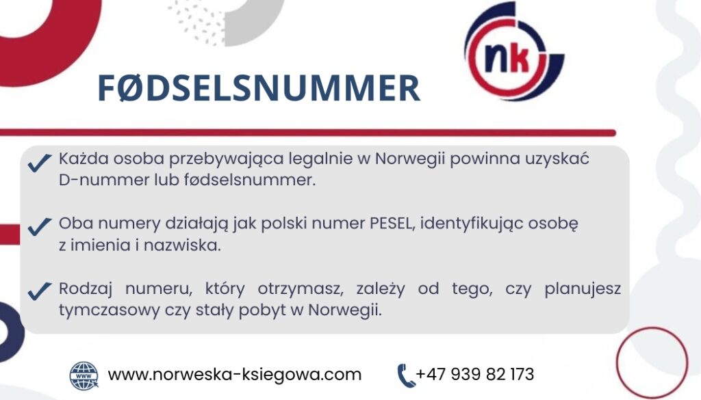 Każda osoba przebywająca legalnie w Norwegii powinna uzyskać D-nummer lub fødselsnummer. Oba numery działają jak polski numer PESEL, identyfikując osobę z imienia i nazwiska. Rodzaj numeru, który otrzymasz, zależy od tego, czy planujesz tymczasowy czy stały pobyt w Norwegii.