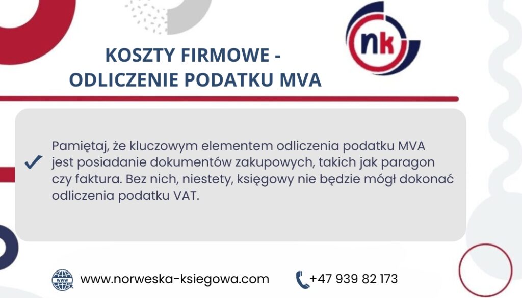 Pamiętaj, że kluczowym elementem odliczenia podatku MVA jest posiadanie dokumentów zakupowych, takich jak paragon czy faktura. Bez nich, niestety, księgowy nie będzie mógł dokonać odliczenia podatku VAT.
