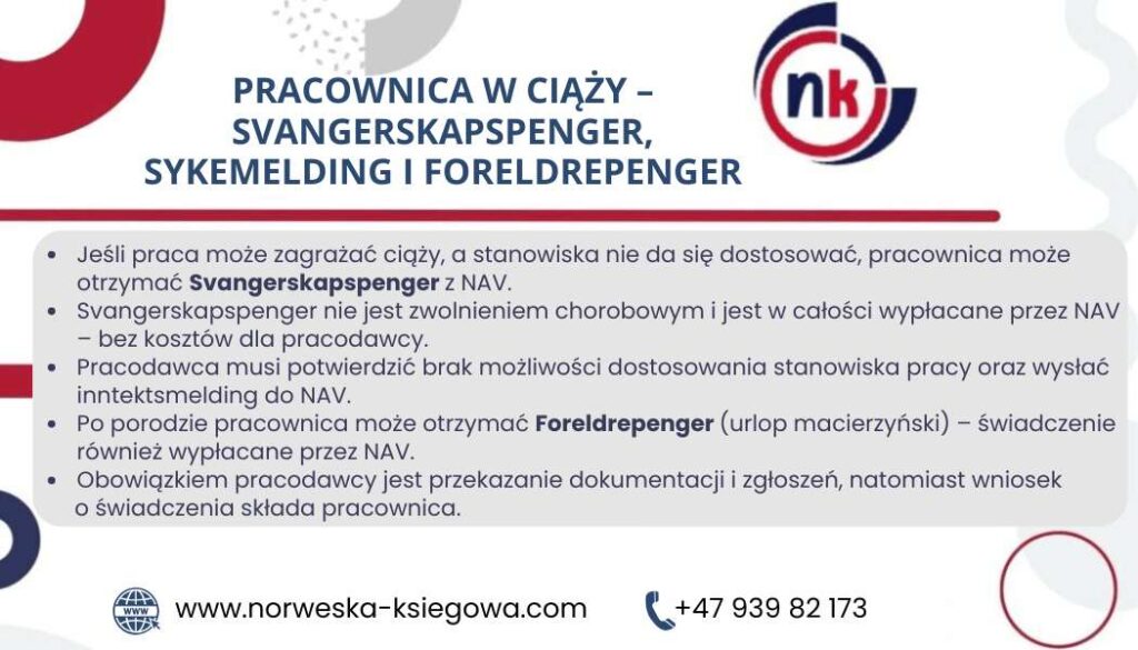 | Sykemelding (zwolnienie lekarskie) | gdy pracownica jest niezdolna do pracy z powodu ciąży | NAV / pracodawca (w zależności od sytuacji) | standardowa obsługa zwolnienia |