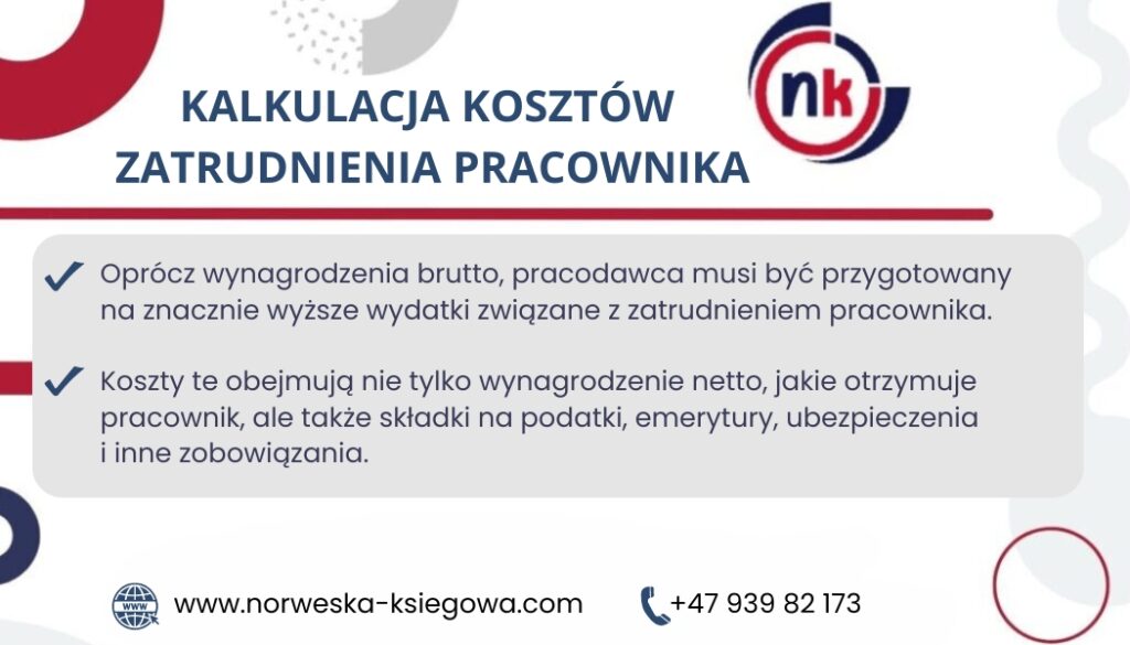 Po odliczeniu podatku pracownik otrzymuje na swoje konto bankowe kwotę netto wynoszącą 26 400 NOK (35 200 NOK – 8 800 NOK). Należy jednak pamiętać, że pensja brutto nie jest jedynym kosztem, jaki ponosi pracodawca.