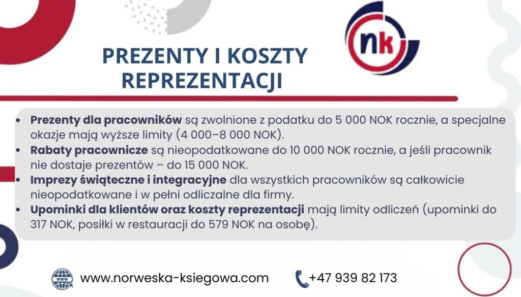 | Prezenty dla pracowników | Dozwolone przedmioty, doświadczenia, bony niewymienialne na gotówkę | • Zwolnienie z podatku do 5 000 NOK rocznie • Powyżej limitu – opodatkowanie i składki |