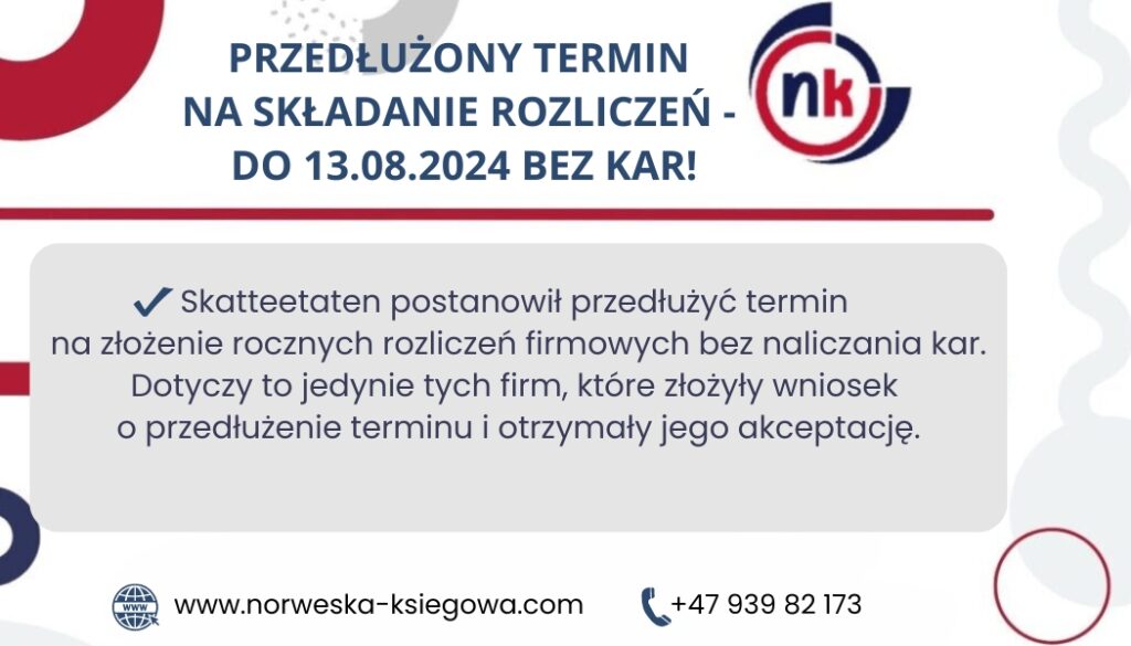Skatteetaten postanowił przedłużyć termin na złożenie rocznych rozliczeń firmowych bez naliczania kar. Dotyczy to jedynie tych firm, które złożyły wniosek o przedłużenie terminu i otrzymały jego akceptację.