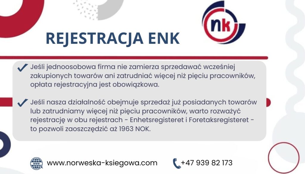 REJESTR ENHETSREGISTERET: ten rejestr stanowi bazę danych wszystkich działających w Norwegii firm. Od 1 stycznia 2024 za rejestrację w tym rejestrze trzeba uiścić opłatę w wysokości 2499 NOK.