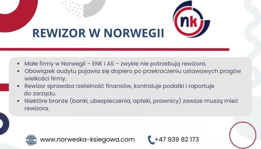 | Enkeltpersonforetak (ENK) – jednoosobowa działalność | Obowiązkowy przy dużej skali działalności | – Aktywa > 20 mln NOK lub – Ponad 20 roboczolat | – Małe ENK nie potrzebują pełnej księgowości ani rewizora, dopóki przychody < 50.000 NOK/rok – Warto monitorować wielkość firmy i przewidywać moment, gdy audyt stanie się konieczny |