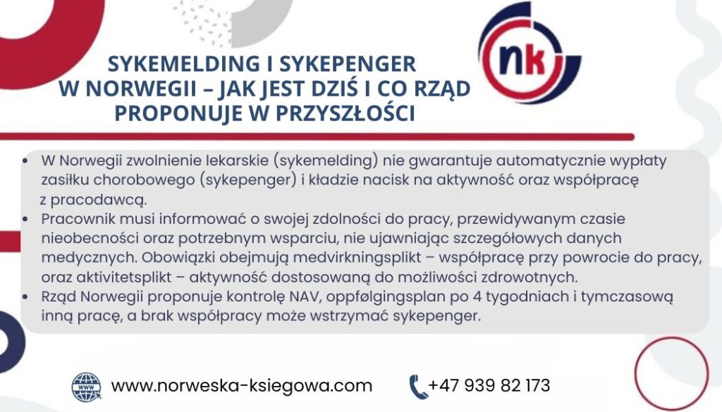 | Podstawa zwolnienia | Zwolnienie lekarskie (sykemelding) jest podstawą do rozpatrzenia prawa do zasiłku chorobowego (sykepenger), ale nie gwarantuje jego wypłaty | Bez zmian w samej konstrukcji, ale większy nacisk na ocenę aktywności od początku nieobecności |