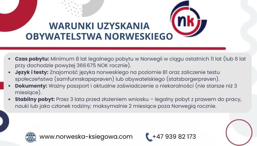 | Czas pobytu w Norwegii | – 8 z ostatnich 11 lat – 6 z 10 lat, jeśli roczny dochód > 366 675 NOK (2024) |