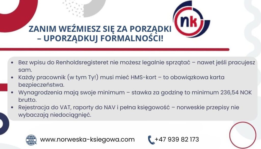 Gdy przyjechałem do Norwegii, sprzątanie wydawało się najprostszą drogą do rozpoczęcia czegoś własnego. Znajomi mówili: „Bierz zlecenia, zakładaj firmę, będzie dobrze”. Szybko się jednak przekonałem, że „dobrze” będzie dopiero wtedy, gdy wszystko zrobi się zgodnie z norweskim prawem – a to wcale nie jest takie oczywiste.