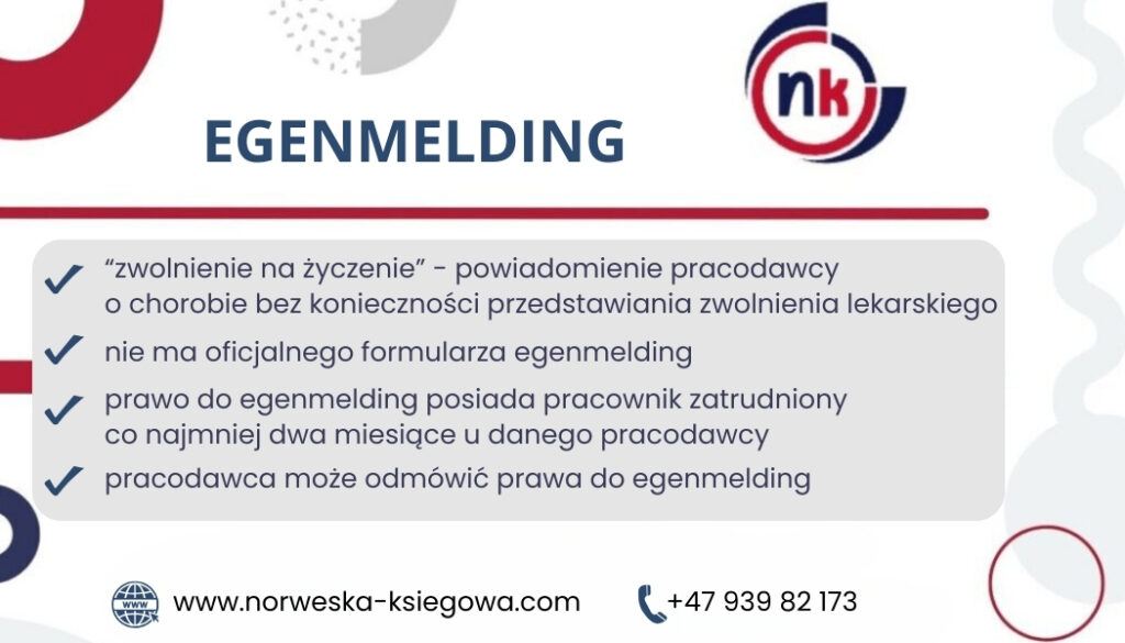 W związku z nadchodzącym sezonem chorobowym, przypominamy pracownikom o możliwości skorzystania z egenmelding. Jest to rozwiązanie, które pozwala zgłosić krótkotrwałą nieobecność z powodu choroby bez konieczności dostarczania zwolnienia lekarskiego.