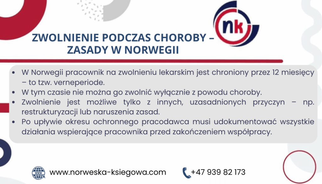 Zgodnie z norweskim prawem pracy (Arbeidsmiljøloven), pracownik przebywający na zwolnieniu lekarskim jest objęty okresem ochronnym – verneperiode, który trwa 12 miesięcy od dnia rozpoczęcia zwolnienia.